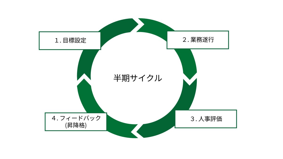 年2回、成長実感を得ながらステップアップすることを目的に、半期サイクルで評価制度を実施。